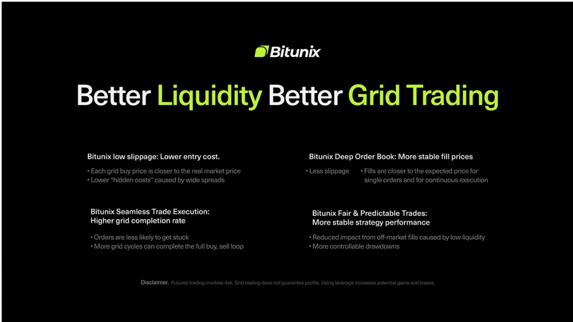 „New Futures Grid ist ein automatisiertes Tool, das Futures-Tradern hilft, ihre Trading-Strategien zu automatisieren. Als Krypto-Derivate-Exchange müssen wir sicherstellen, dass wir unseren Nutzern die fortschrittlichsten Tools in diesem Bereich bereitstellen“, sagte Gu. „Was die Nutzung dieses Futures Grids bei Bitunix besonders geeignet macht, ist unsere tiefe Liquidität – ein wichtiger Faktor, damit dieses Tool vollständig funktionsfähig ist.“
